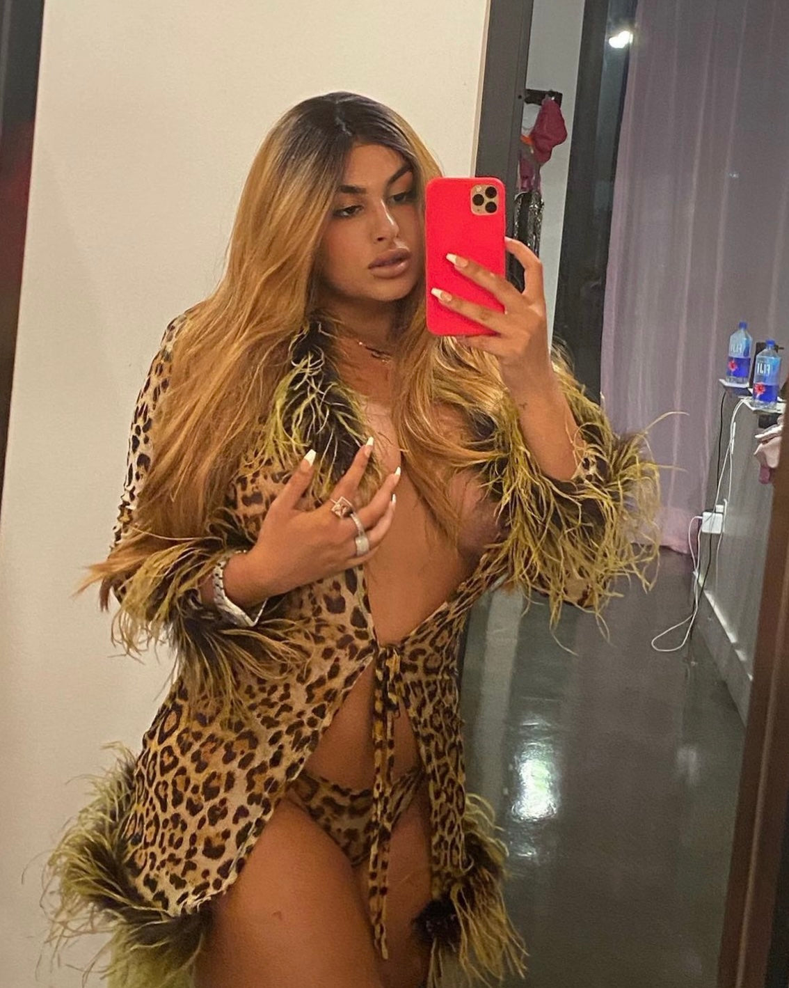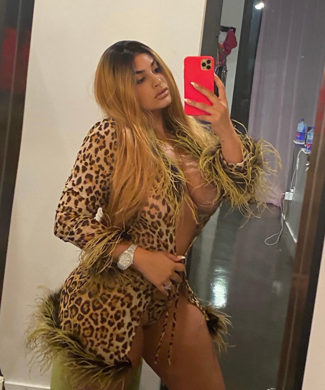 - Mesh cheetah robe long sleeve with ostrich trimming