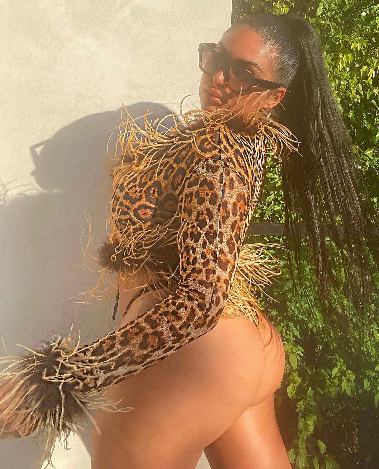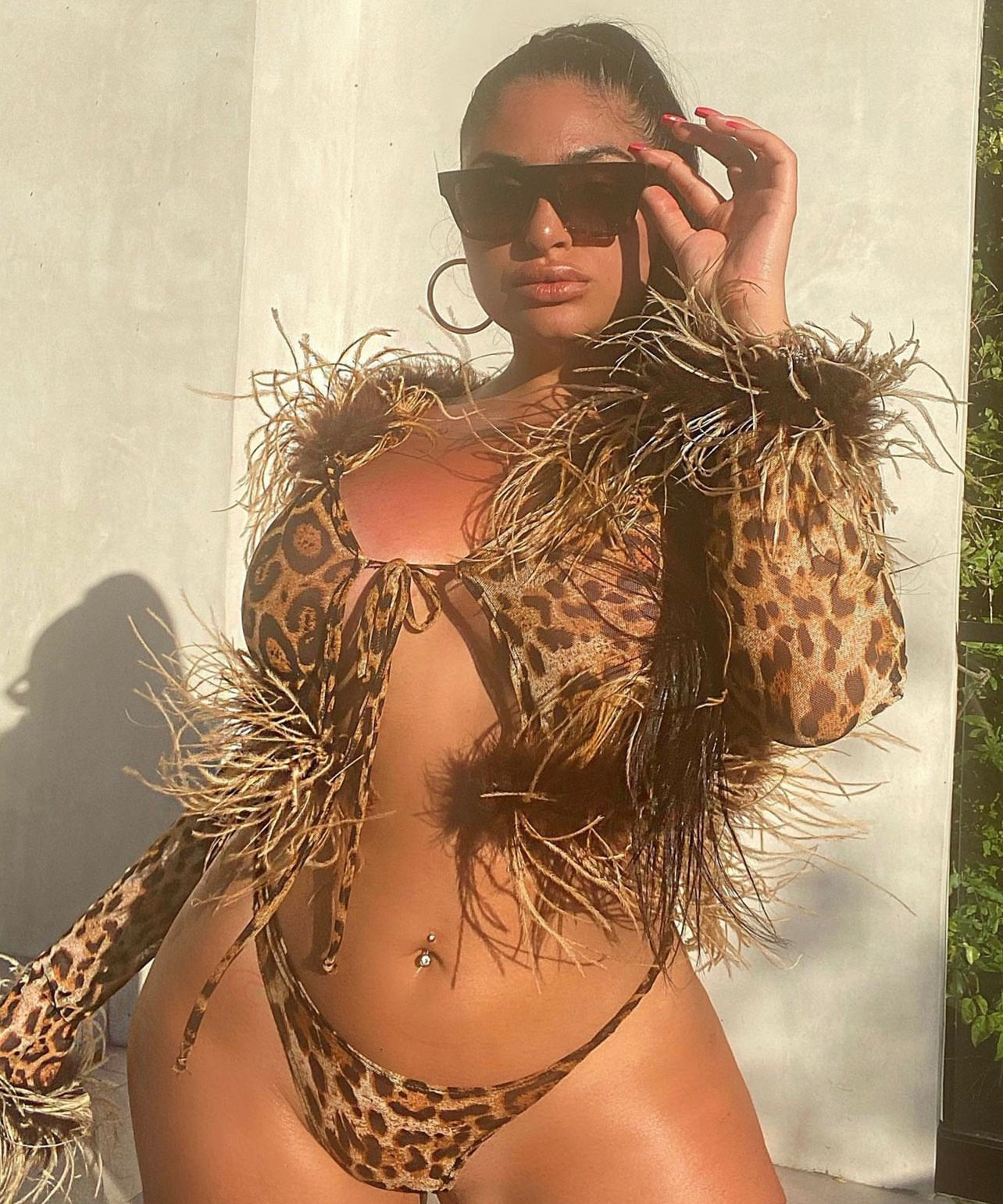 - Mesh cheetah cropped long sleeve with ostrich trimming