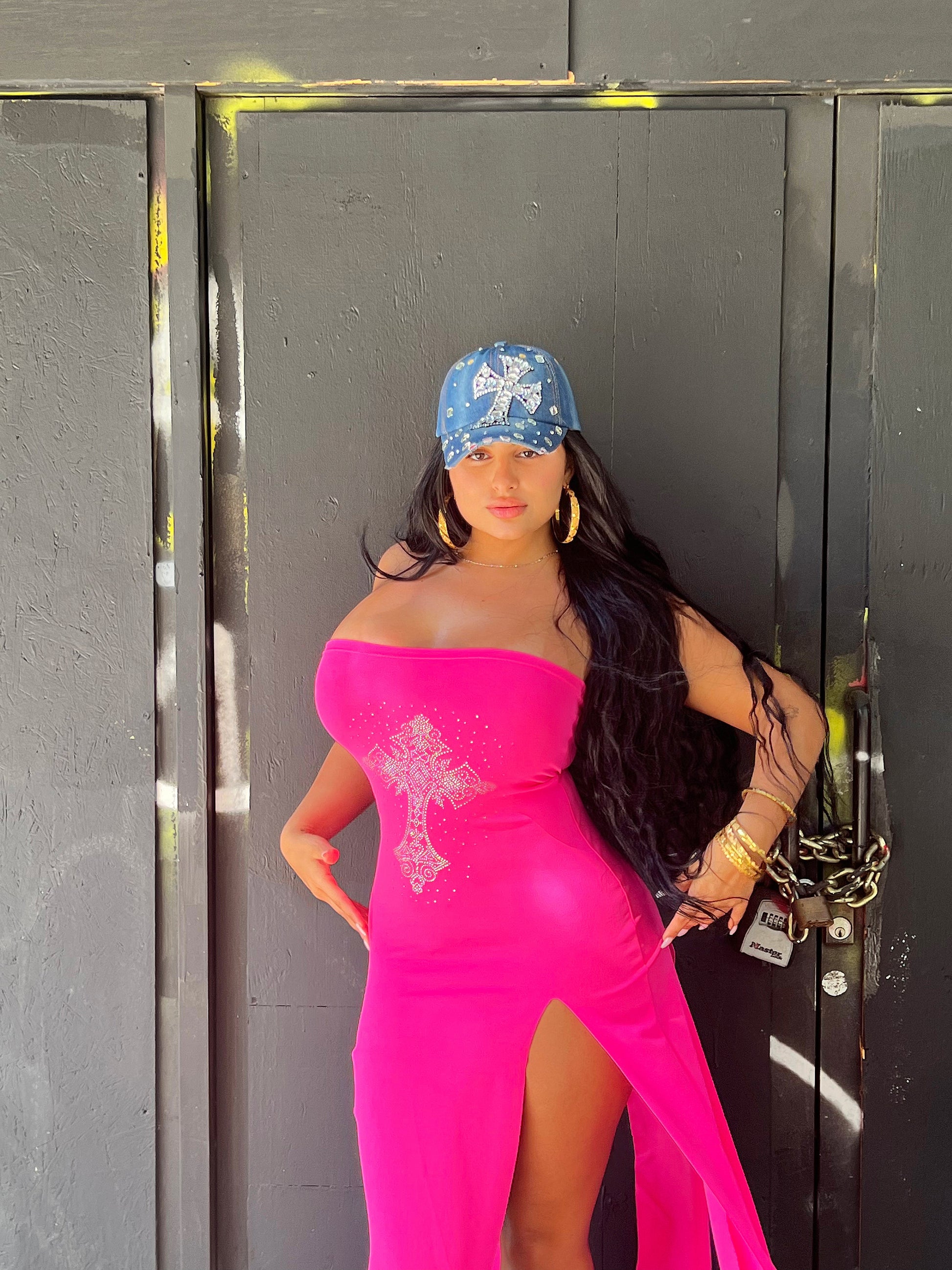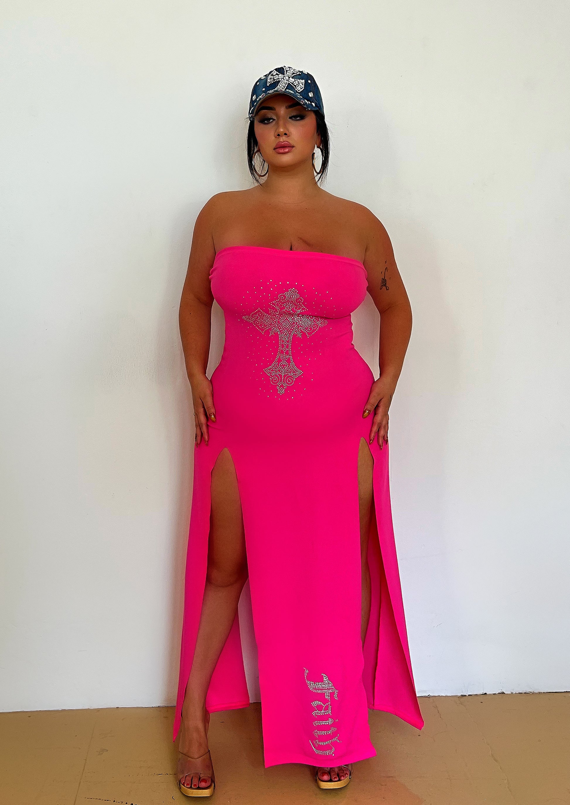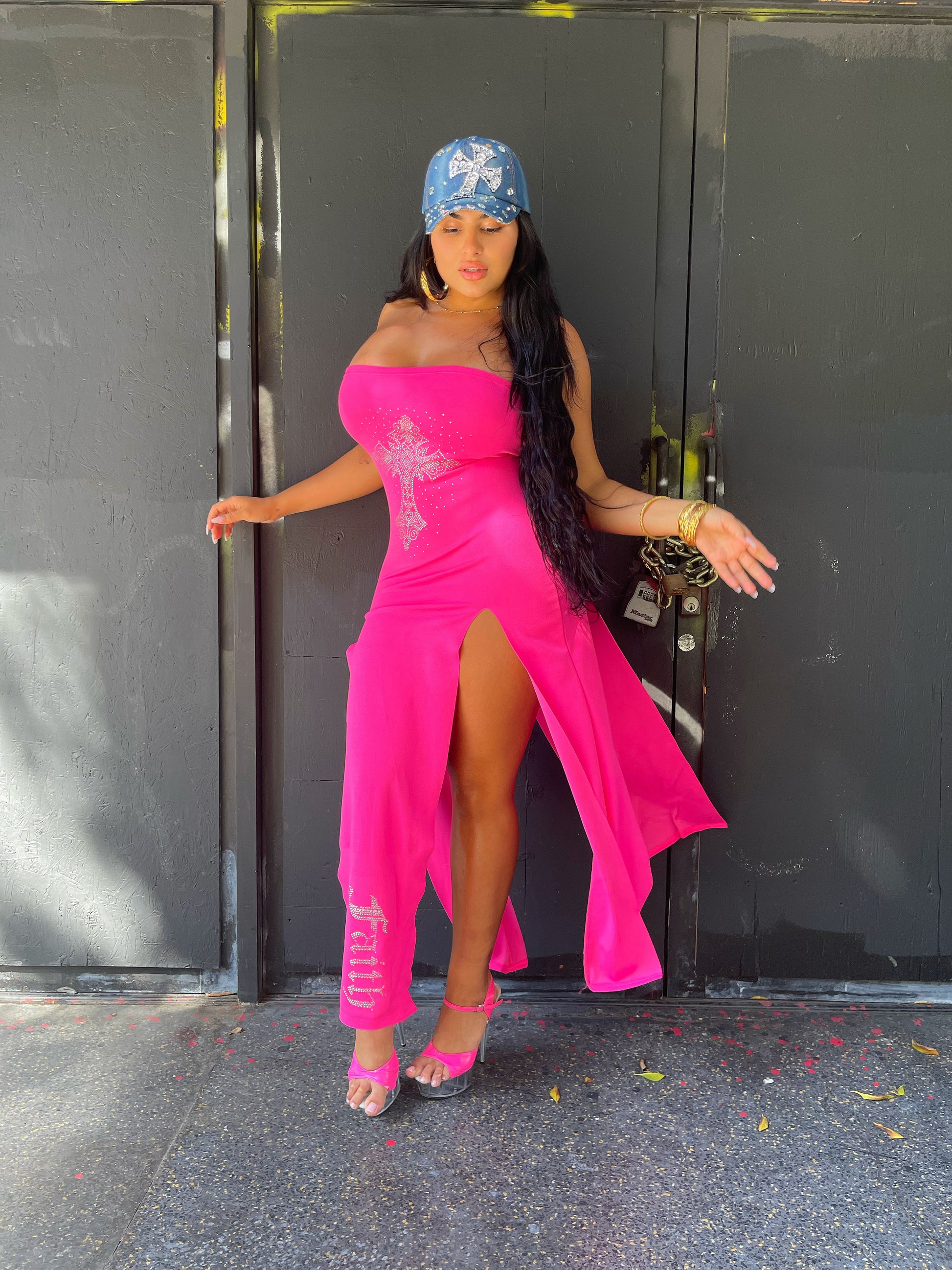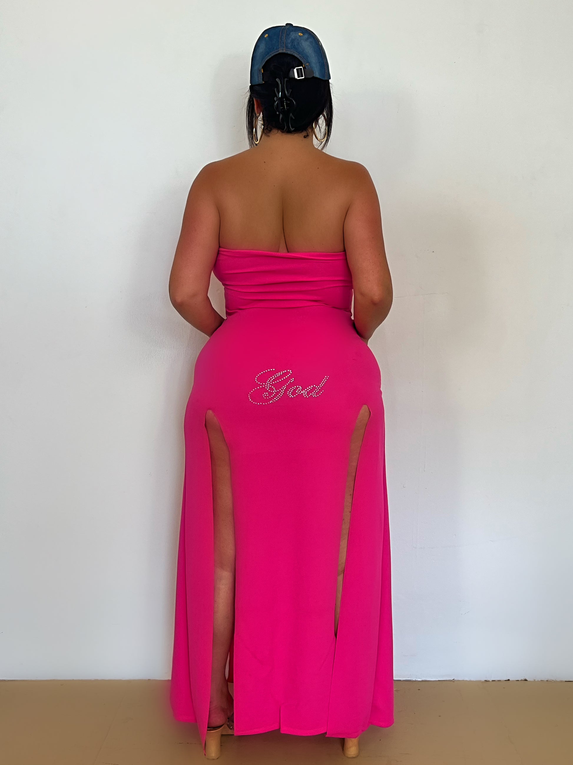 - Pink slit dress (both sides) - front and back